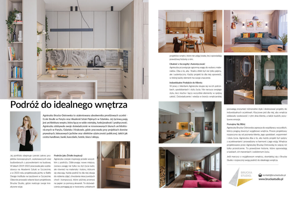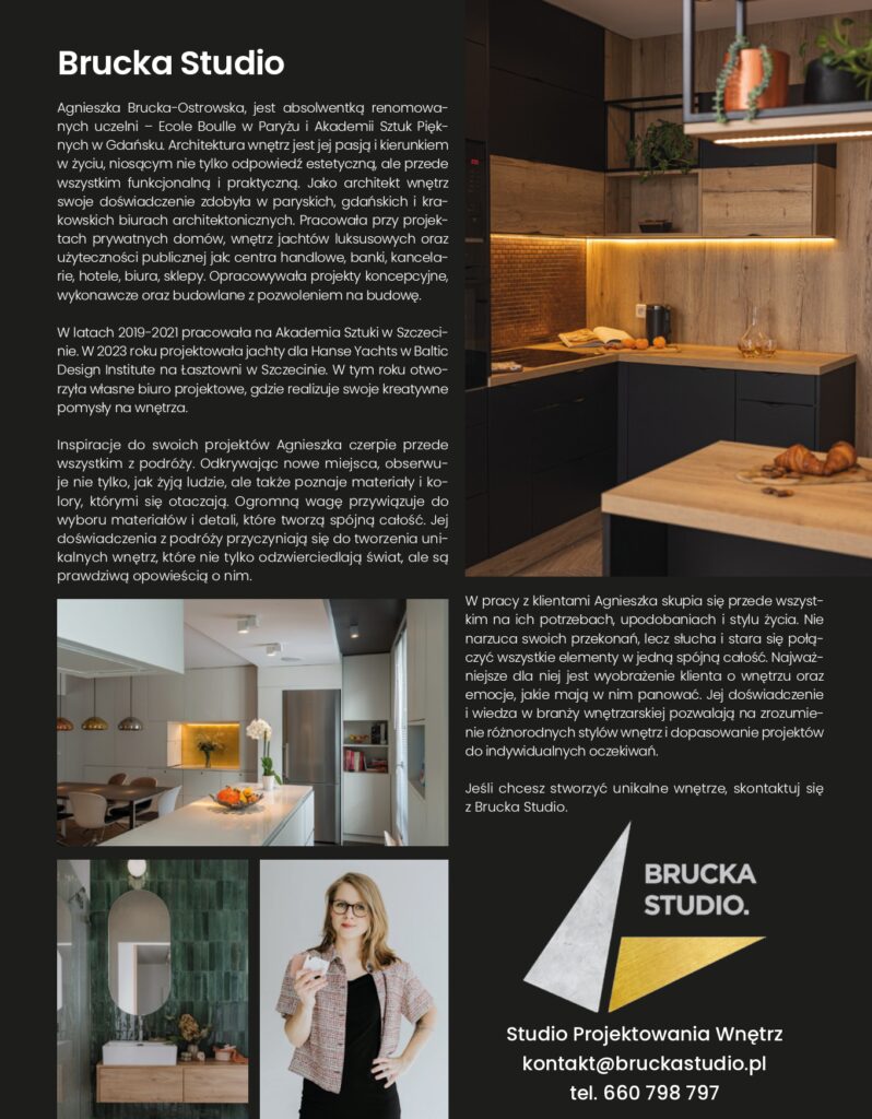 Nazywam się Agnieszka Brucka-Ostrowska i od lat tworzę wnętrza, w których estetyka spotyka się z funkcjonalnością.