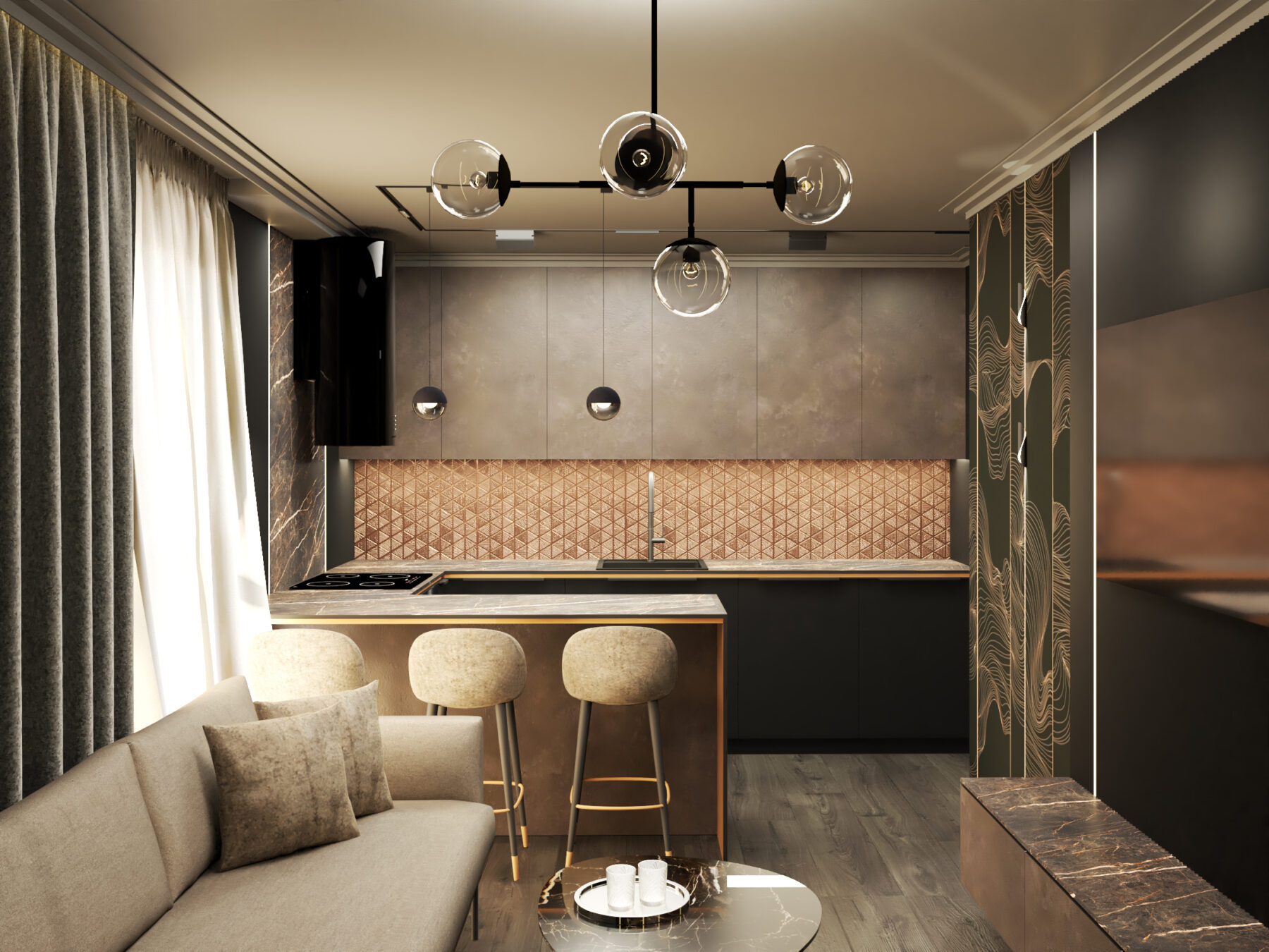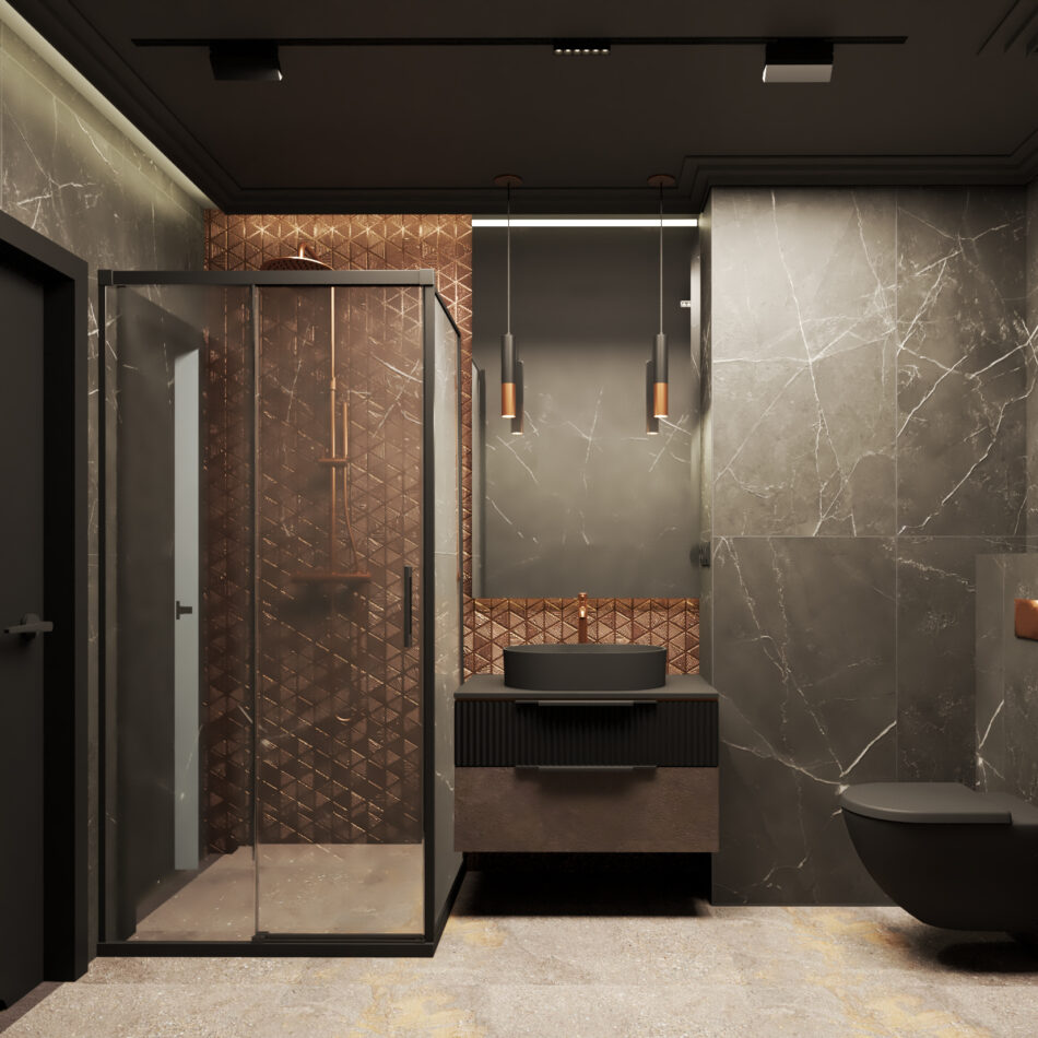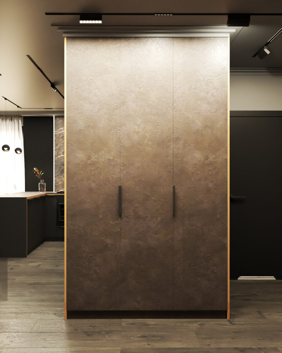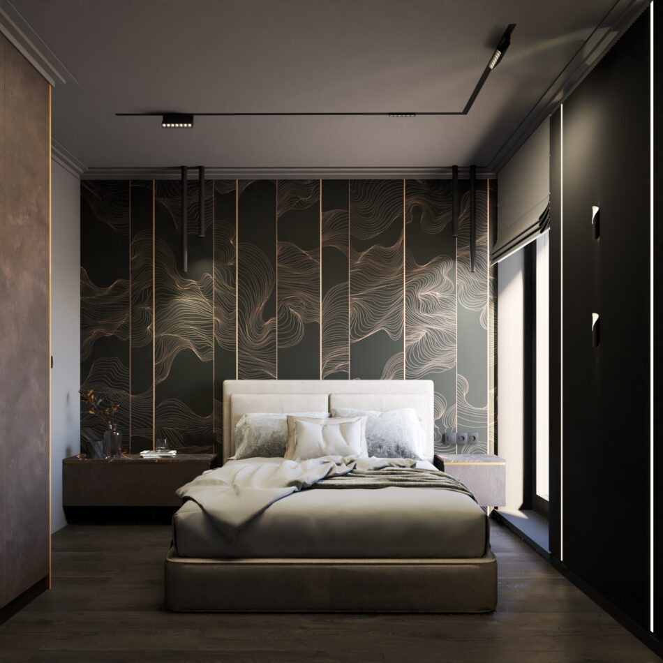 Czarne wnętrze z miedzianymi akcentami – elegancja w czystej postaci. Subtelna gra kontrastów i wyszukany styl życia na każdym kroku. Detale na meblach, efektowna tapeta z wzorem oraz sztukateria nadają przestrzeni unikalny charakter. To wnętrze, które emanuje klasą i niepowtarzalnym klimatem.