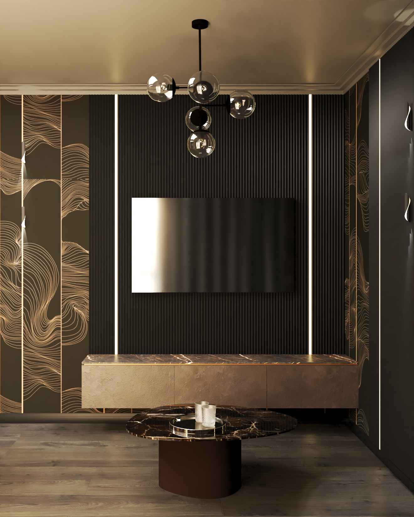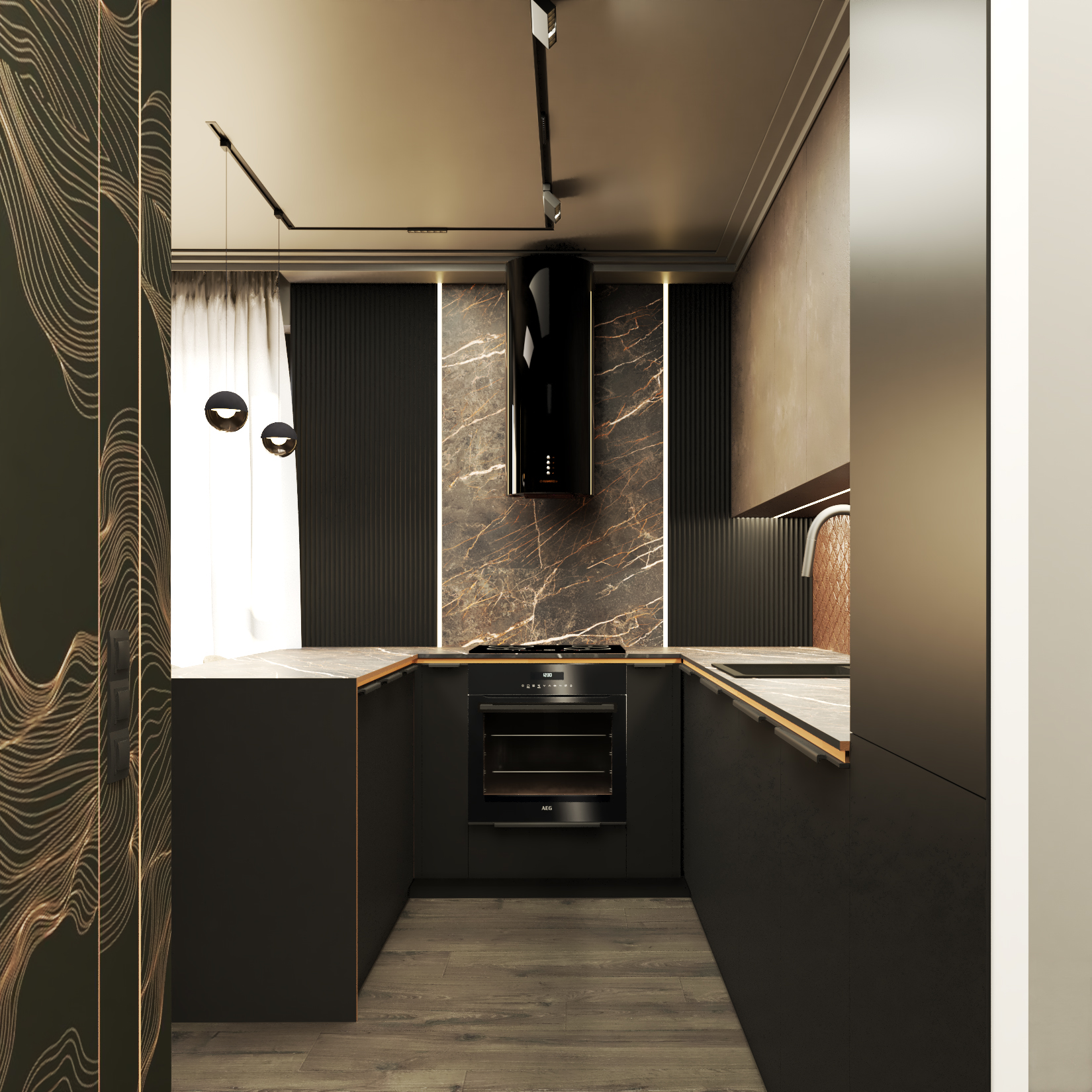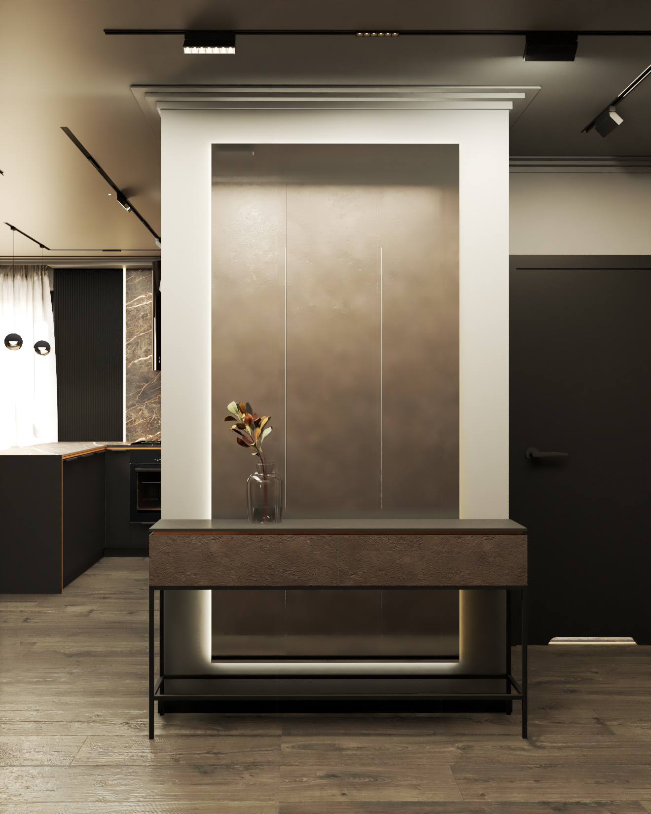 Czarne wnętrze z miedzianymi akcentami – elegancja w czystej postaci. Subtelna gra kontrastów i wyszukany styl życia na każdym kroku. Detale na meblach, efektowna tapeta z wzorem oraz sztukateria nadają przestrzeni unikalny charakter. To wnętrze, które emanuje klasą i niepowtarzalnym klimatem.